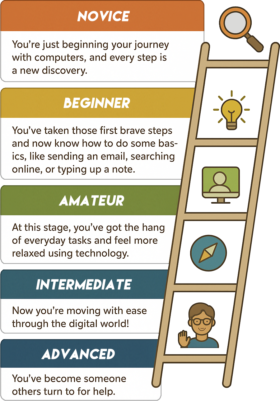 Seniority Support services are rated by their technology proficiency requirements. We specialize in helping users who are just starting out with basic devices, all the way to more advanced services and technology. Please refer to our skill level assessment chart below to see what services are available to you.